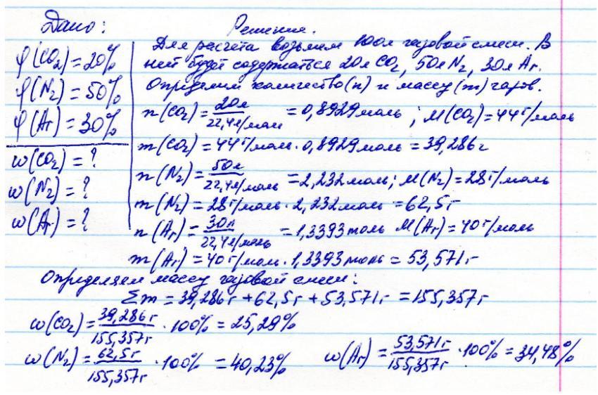 Определите массовые доли газов в смеси, если объемные доли оксида углерода(IV), азота и аргона соответственно равны 20, 50 и 30%.