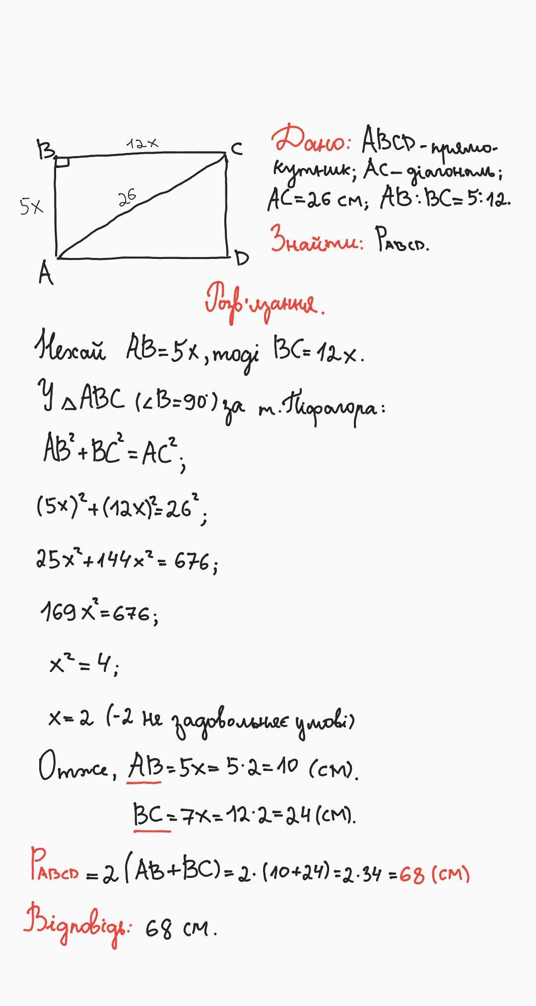 Дiагональ прямокутника 26 см, а його сторони вiдносяться як 5:12. Знайдiть периметр прямокутника