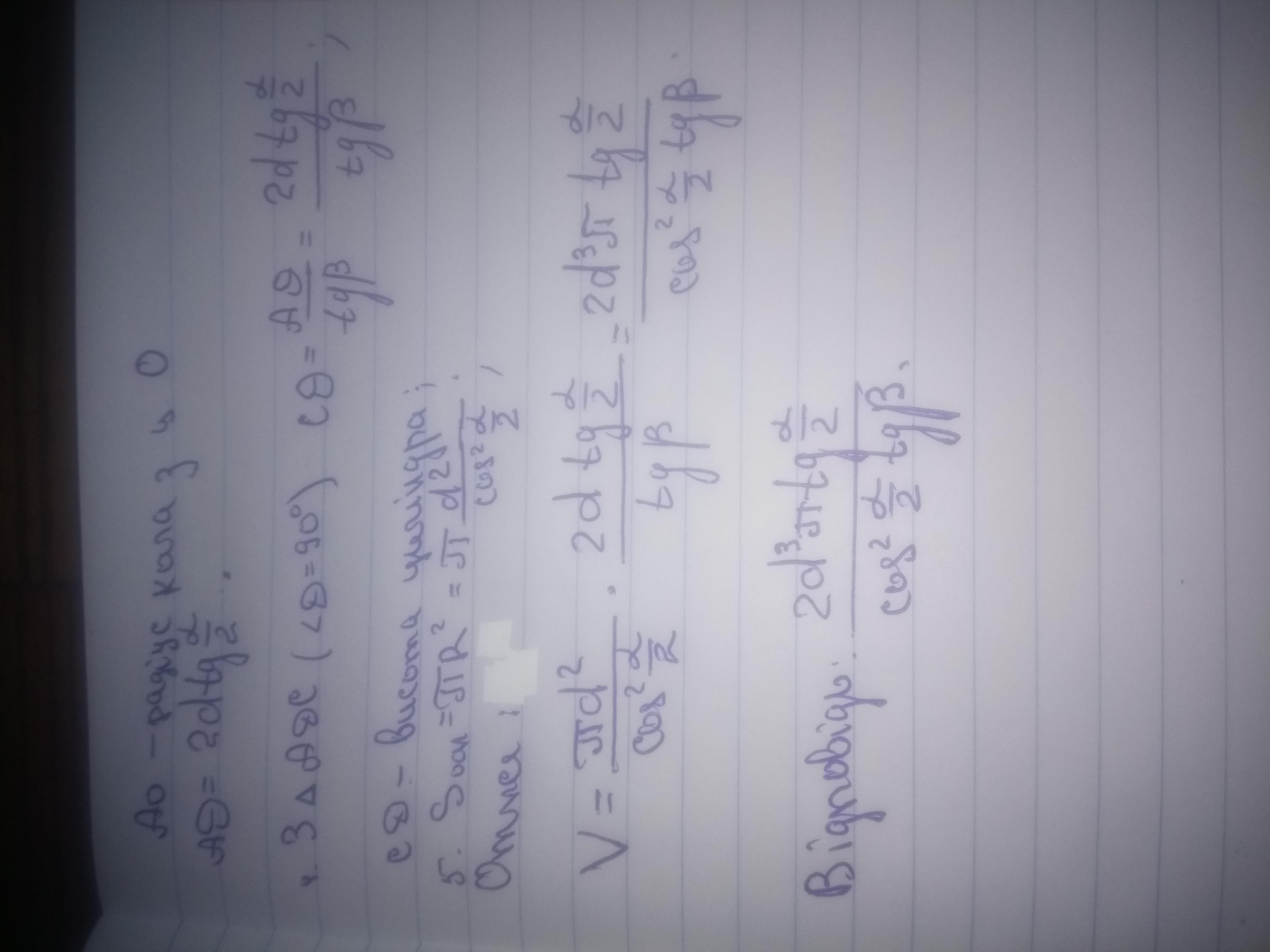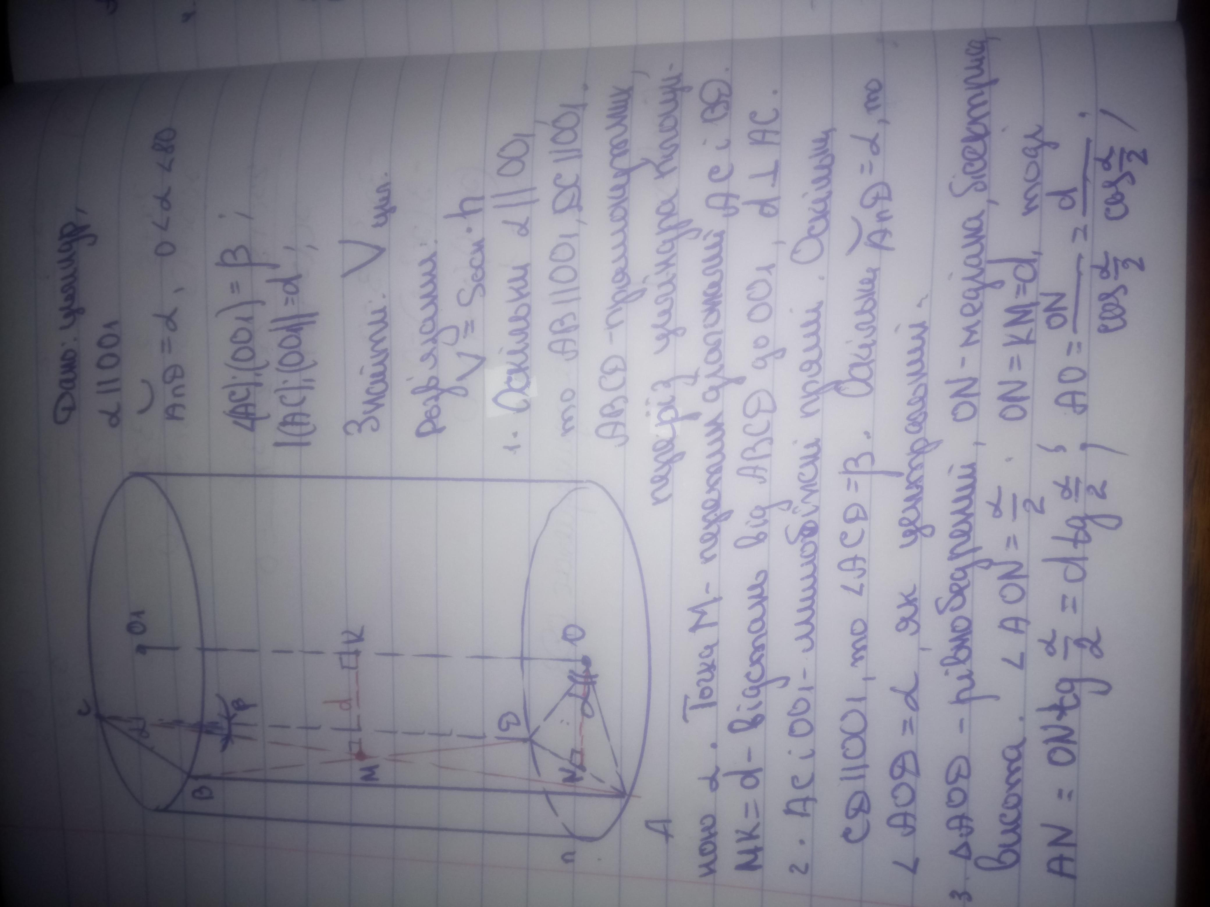 Площина паралельна осі циліндра , відтинає від кола основи дугу, градусна міра якої дорівнює альфа, 0<альфа<80.Діагональ отриманого перерізу утворює з віссю циліндра кут бета і віддалена від неї на відстань d.Знайдіть обєм циліндра.