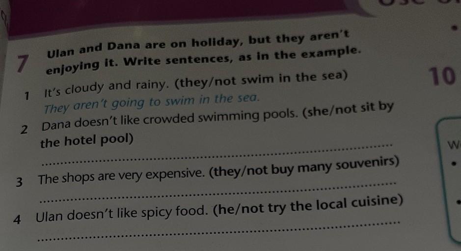 Ulan and Dana are on holiday , but they aren't enjoying it. Write sentences, as in the example