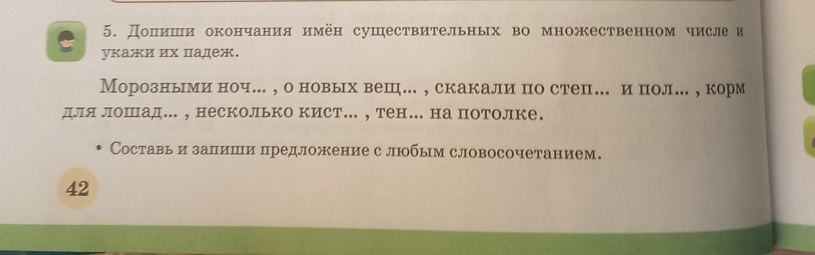 Морозными ночами - творительный падеж; о новых вещах - предложный падеж; скакали по степям и полям - дательный падеж; корм для лошадей - Родительный падеж; несколько кистей - Родительный падеж; тени на потолке - винительный падеж.