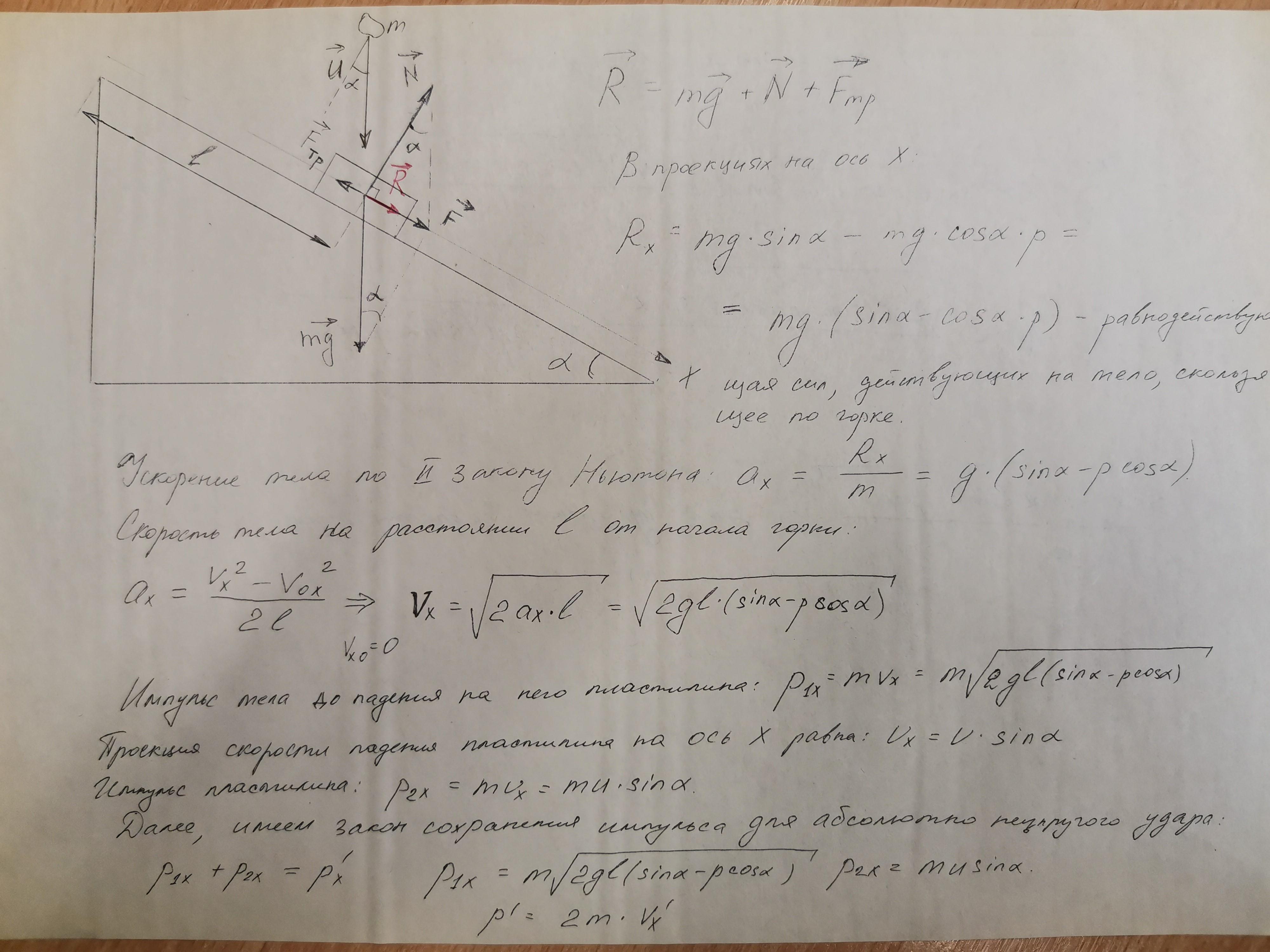 На тело массы m, скользящего без начальной скорости по горке с коэффициентом трения р падает кусок пластилина массой m со скоростью v Как изменится скорость тела если пластилин падает вертикально на расстоянии l от начала горки. Наклон плоскости-а