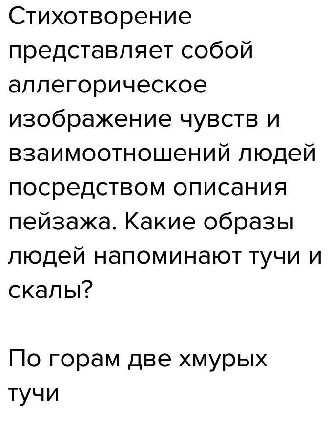 Яркие образы туч и скал не указывают на конкретных людей, а за противоречиями можно уследить конфликты, ссоры, которые распространены в любом обществе. К примеру, ссора между родителями, конфликты между странами. В своем произведении Полонский хотел донести, что агрессией нельзя порадить любовь, лишь усмерение и боль другим, если не себе.