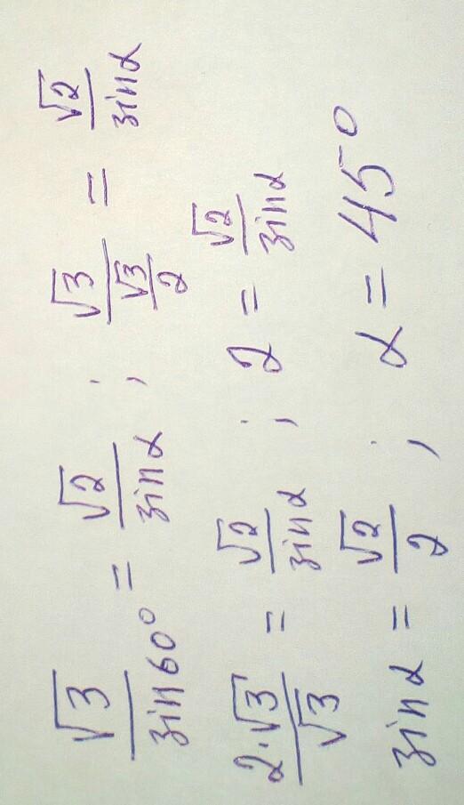 в треугольнике сторона, лежащая напротив угла в 60 градусов равна √3 . Найдите угол треугольника, лежащей напротив стороны, равной √2