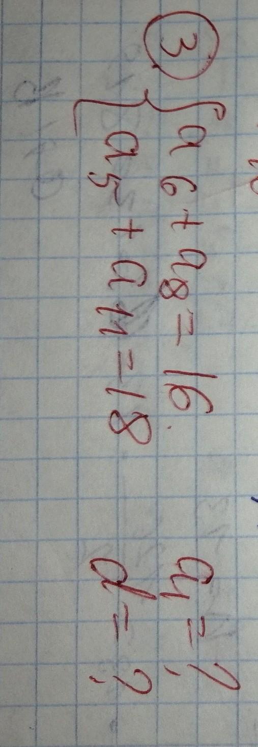1) Сначала записываем все числа арифм. прогрессии через а1 по формуле an = a1 + d(n - 1) . Далее верхнюю часть системы умножаем на минус 1, чтобы получить уравнение с одной переменной. Прибавляем уже умноженную на минус 1 верхнюю часть с нижней частью и получаем d. Далее просто подставляем d в любое удобное для нас уравнение чтобы получить a1.