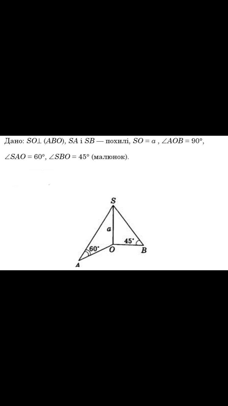 Ответ:1) проекція похилої SA на площину АОВ = → а), 4) відстань між основами похилих = → д), 3) довжина похилої SB = → г), 2) проекція похилої SB на площину АОВ = → в), 5) відстань між прямими SO і АВ = → є)