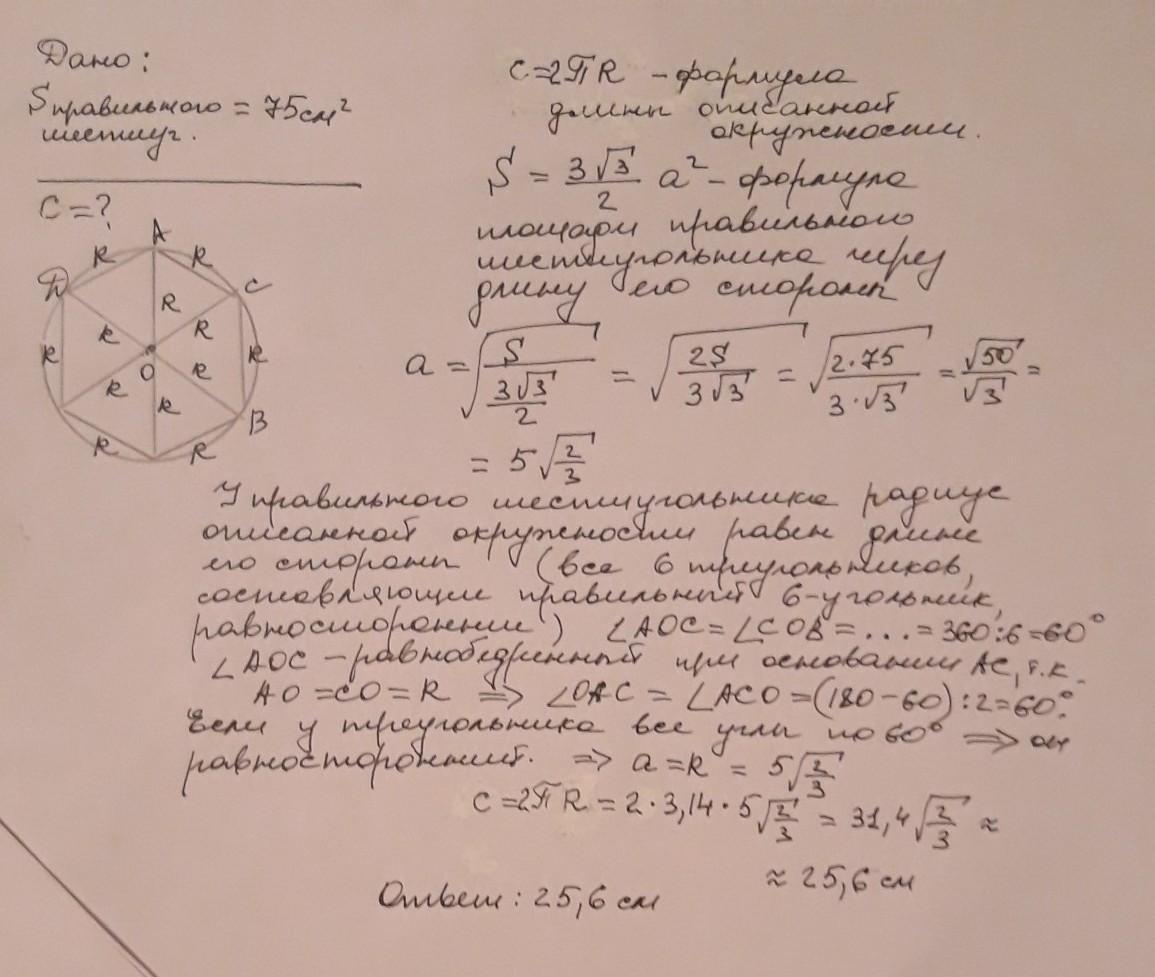 Найдите длину окружности, если площадь вписанного в нее правильного шестиугольника равна 75 см2
