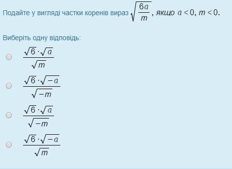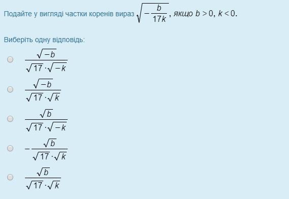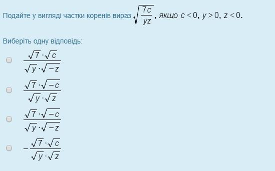 1); ; c<0; ,; y>0; ,; z<0:; ; sqrt{frac{7c}{yz}}=frac{sqrt7cdot sqrt{-c}}{sqrt{y}cdot sqrt{-z}}\\2); ; b>0; ,; k<0:; ; sqrt{-frac{b}{17k}}=frac{sqrt{b}}{sqrt{17}cdot sqrt{-(-k)}}=frac{sqrt{b}}{sqrt{17}cdot sqrt{k}}\\3); ; a<0; ,; m<0:; ; sqrt{frac{6a}{m}}=frac{sqrt6cdot sqrt{-a}}{sqrt{-m}}\\4); ; c>0:; ; sqrt{frac{c}{2}}=frac{sqrt{c}}{sqrt2}