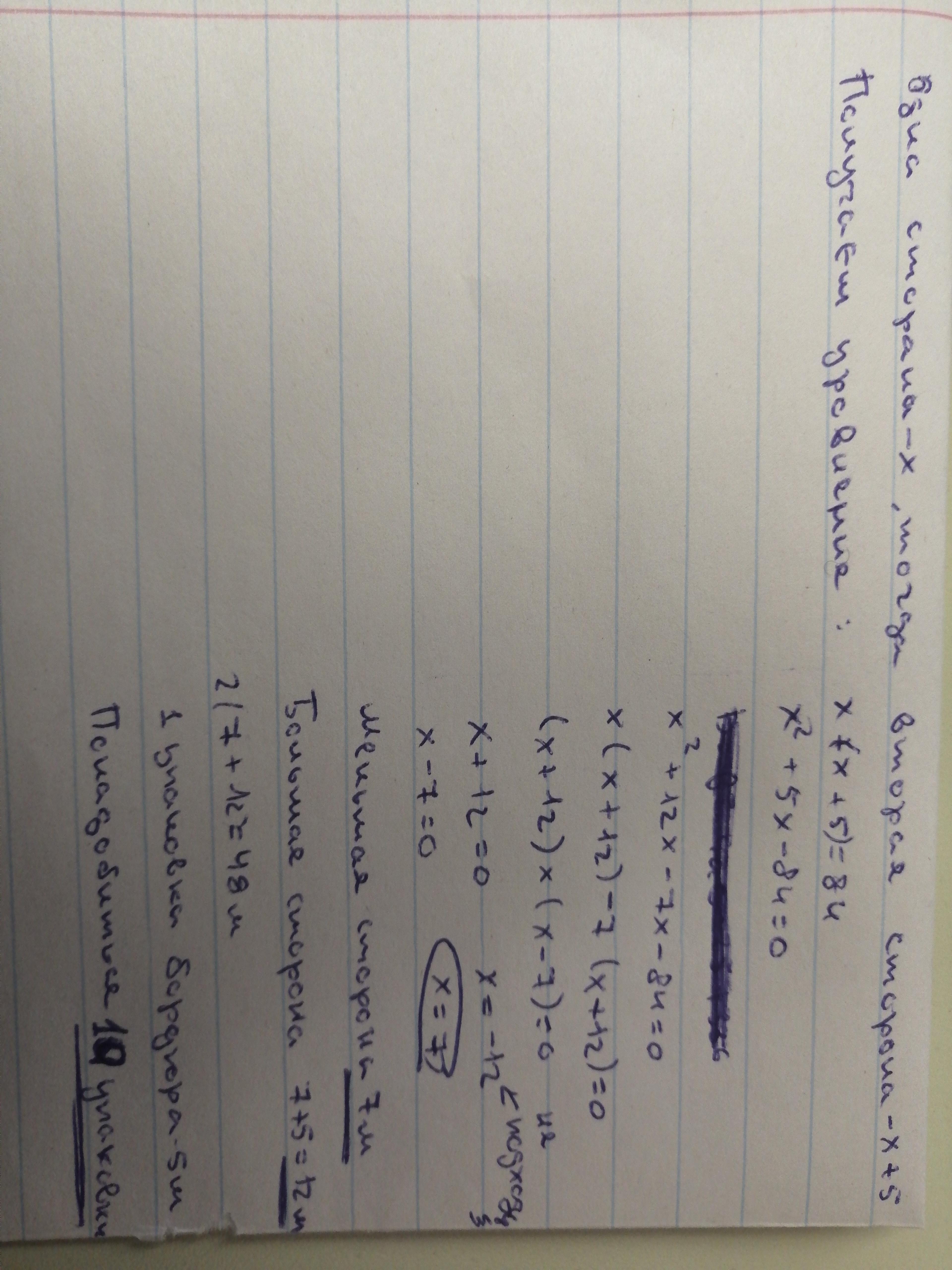 Детская площадка имеет форму прямоугольника, площадь которого равна 84 м2. Одна его сторона на 5 метр(-ов, -а) больше, чем другая. Детской площадке необходимо построить бордюр. В магазине продаётся материал для бордюра в упаковках. В одной упаковке имеется 5 метров(-а) материала.