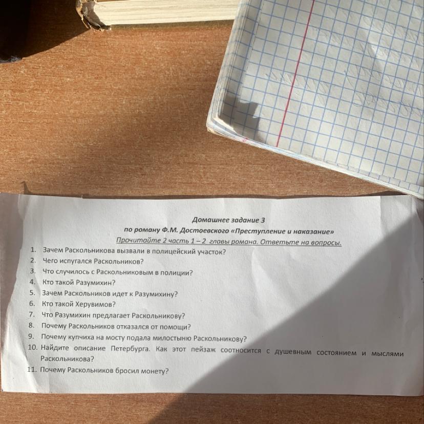 Ответ:1. Раскольников не догадывается, по какой причине его вызывают. Решает, что его таким образом хотят заманить в ловушку. На самом же деле его вызвали по делу о взыскании денег квартирной хозяйкой.
