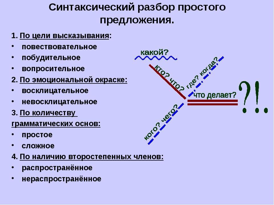 Определить тип предложения по цели высказывания (повествовательное, вопросительное, побудительное). Указать вид предложения по эмоциональной окраске (восклицательное, невосклицательное). Далее понять, простое предложение или сложное.