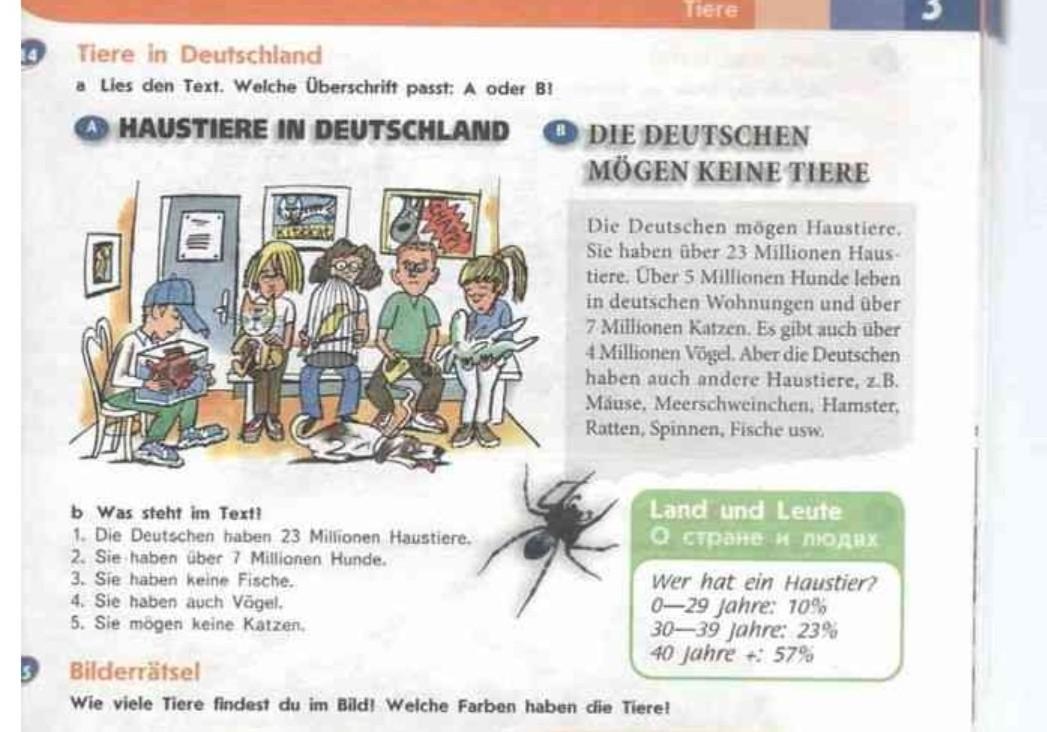 Немцы любят домашних животных. Они имеют около 23 миллионов домашних животных. В немецких квартирах живёт около 5 миллионов собак и 7 миллионов кошек. Имеется также примерно 4 миллиона птиц. Но немцы имеют и других животных. Например: мышей, морских свинок, Хомяков,крыс, пауков, рыб и так далее.