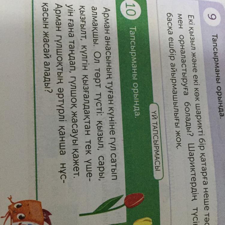 Гүл шоғындағы қызғалдақ гүлдерінің орналасу тәртібі маңызды емес. Олардың түстері ғана маңызды. Шарт бойынша барлық үш қызғалдақ түрлі түсті болуы керек. Сондықтан қайталаумен комбинация үшін формуланы қолданамыз.