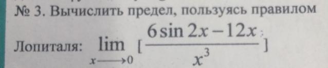 displaystyle lim_{x to 0}dfrac{6sin 2x-12x}{x^3}=lim_{x to 0}dfrac{(6sin 2x-12x)'_x}{(x^3)'_x}=lim_{x to 0}frac{6cdot 2cos 2x-12}{3x^2}=\ \ \ =lim_{x to 0}frac{(12cos 2x-12)'}{(3x^2)'}=lim_{x to 0}frac{-24sin2x}{6x}=lim_{x to 0}frac{(-24sin 2x)'}{(6x)'}=\ \ \ =lim_{x to 0}frac{-48cos 2x}{6}=frac{-48}{6}=-8