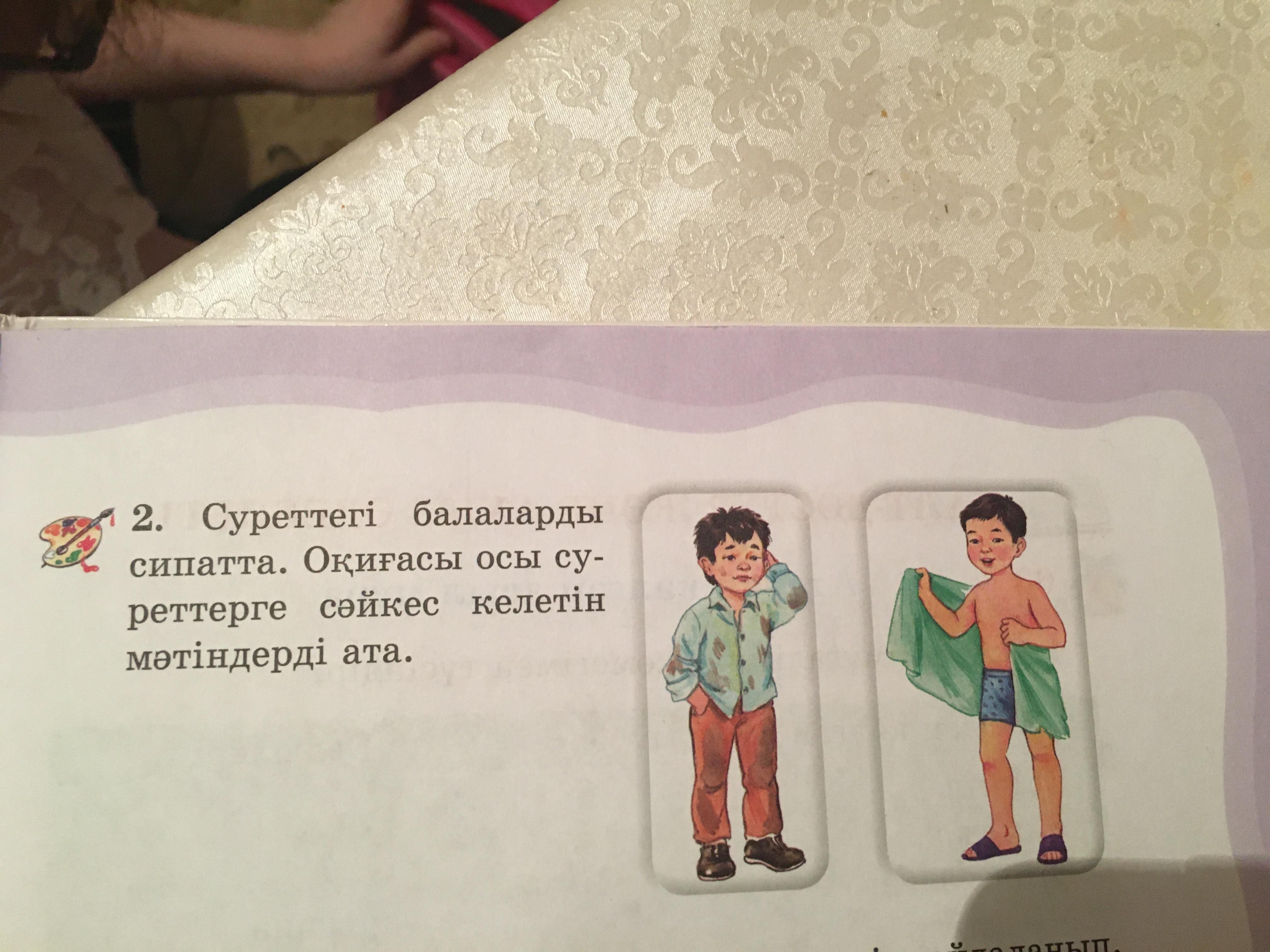 Бiрiншi сурете баланын устi-басы лас, кыр кожалак. Екинши сурете бала жуынып, тазаланып, устiн суртип жатыр. Осыган сайкес келетин матин:тазалык - денсаулық кепiлi.