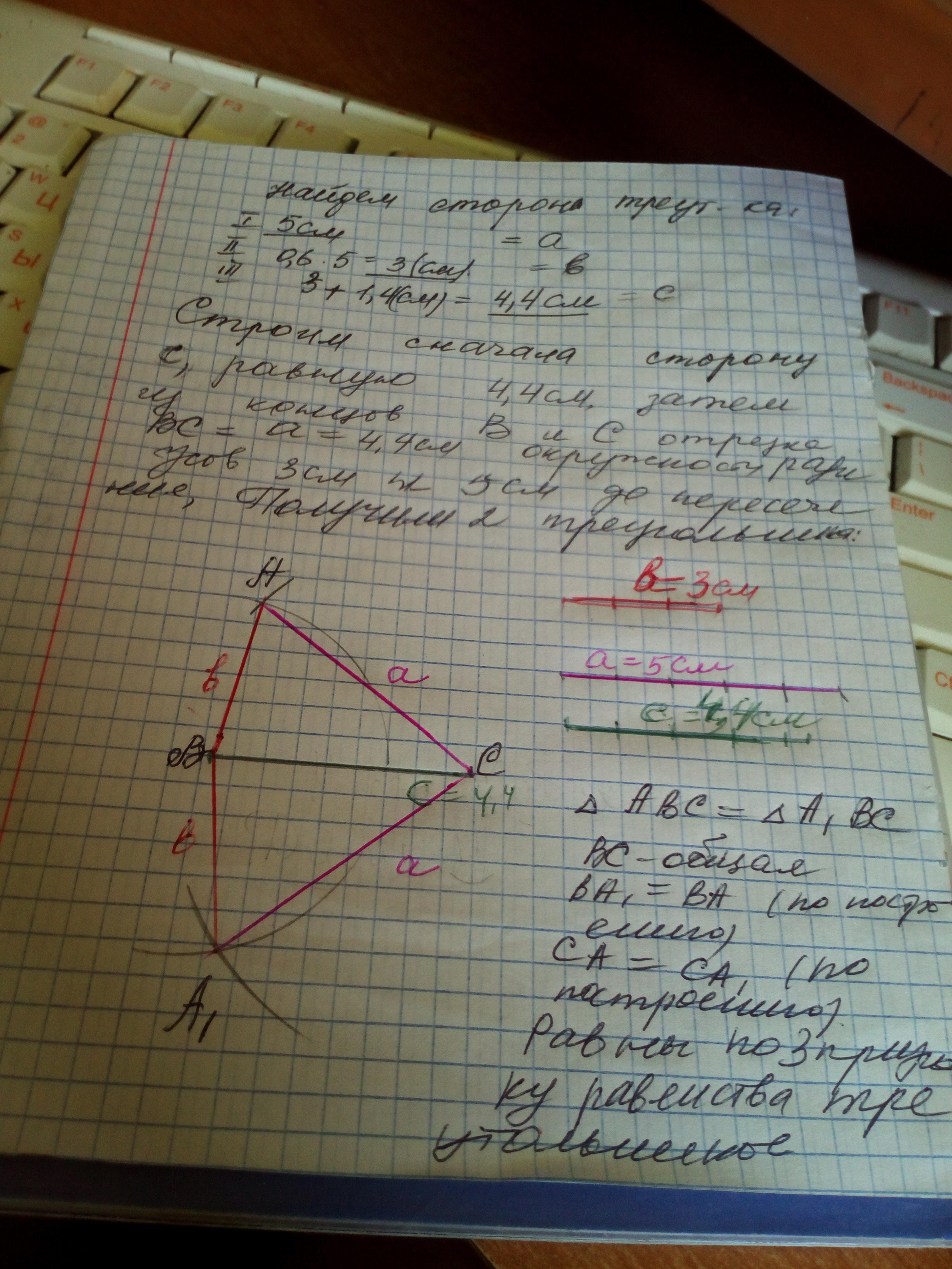 Одна сторона треугольника равна 5 см, вторая сторона составляет 60% от первой стороны. Третья сторона на 1, 4 см длиннее второй стороны. Построй этот треугольник.