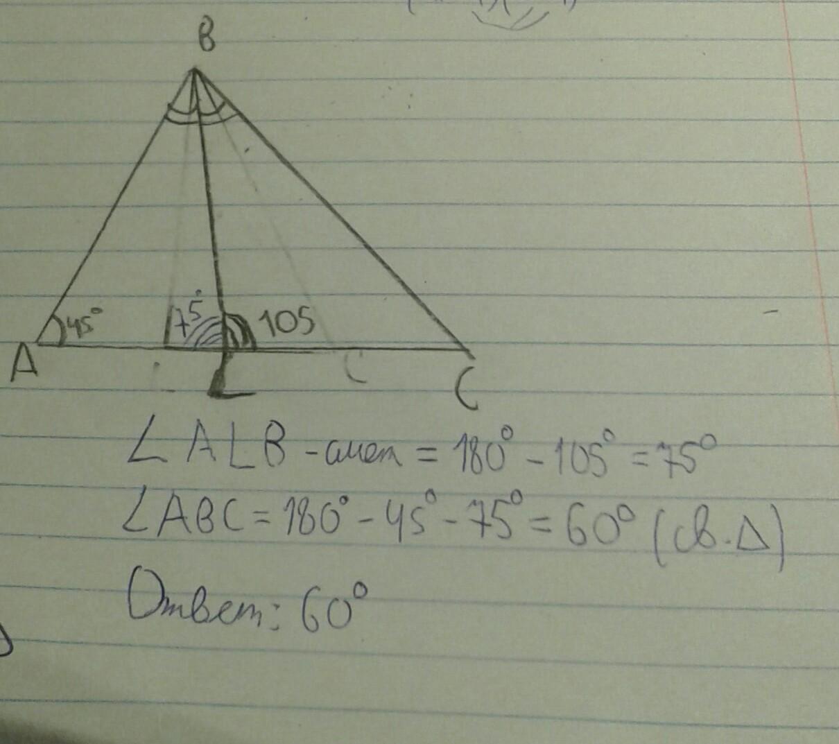 В ТРЕУГОЛЬНИКЕ ABC проведена биссектриса BL угол BAC =45 градусов,угол BLC =105 градусов найдите угол ABC
