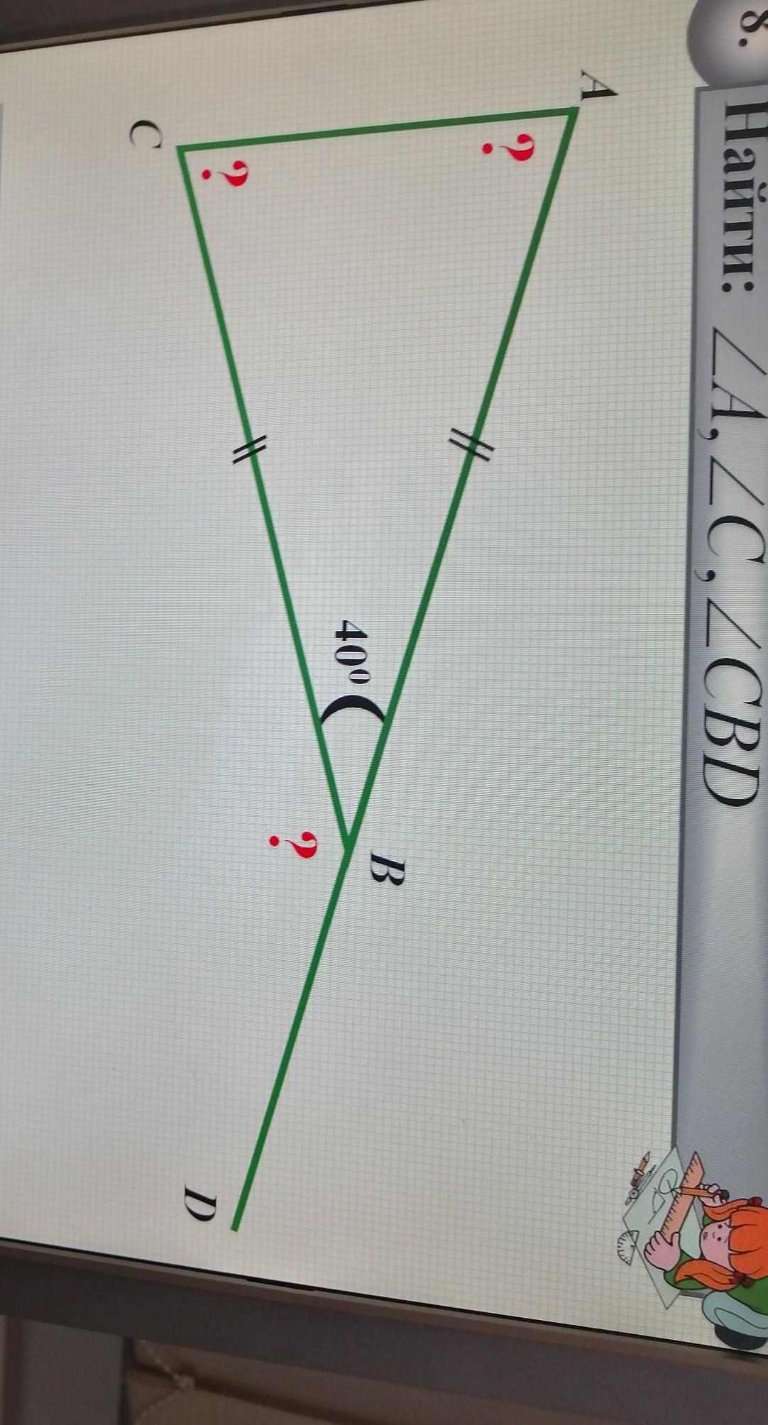 1. В треугольнике сумма углов = 180° и треугольник АBC - равнобедренный следовательно, угол BAC = углу АСВ= (180-40):2= 70°