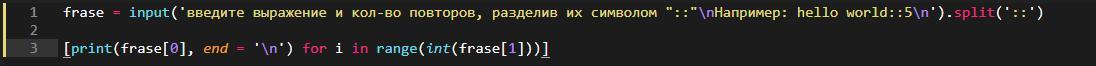 frase = input('введите выражение и кол-во повторов, разделив их символом "::"nНапример: hello world::5n').split('::')