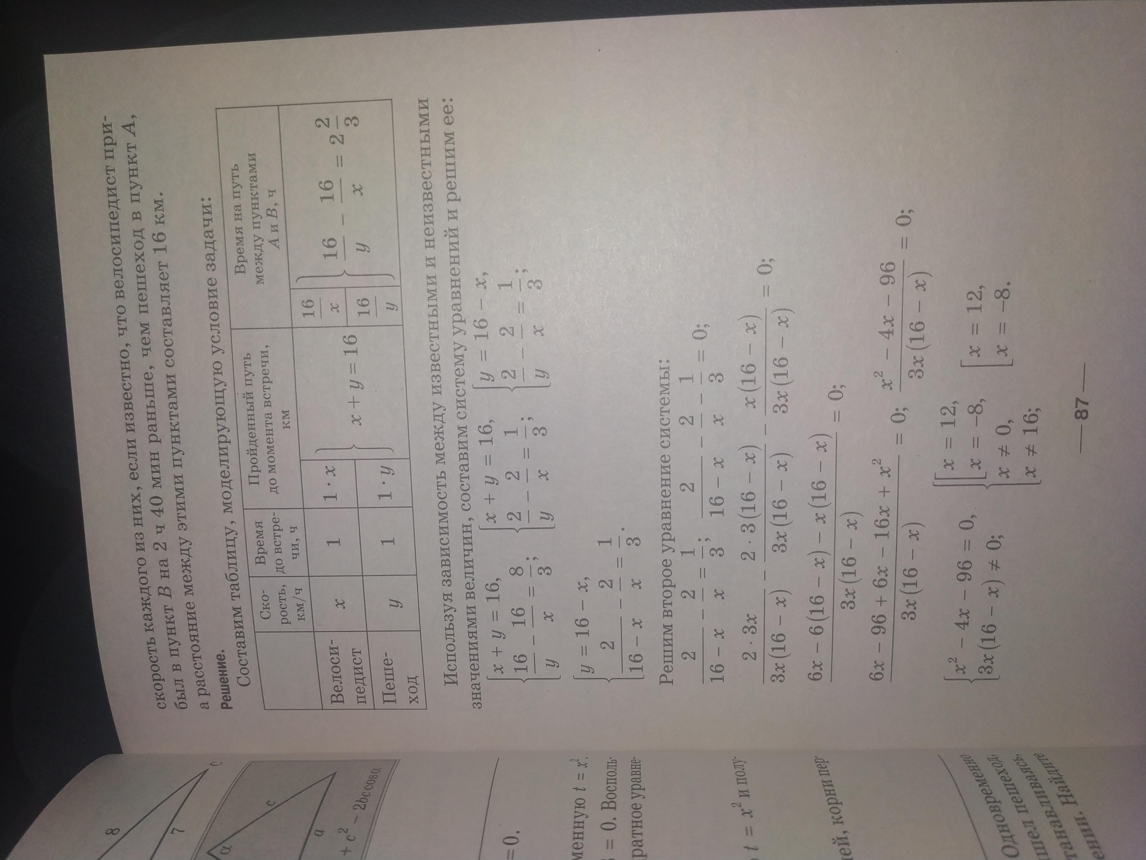 Из пункта А в пункт В выехал велосипедист. Одновременно с ним из пункта В навстречу велосипедисту вышел пешеход, и они встретились через 1ч. После встречи они, не останавливаясь, продолжили движения каждый в своём направлении. Найдите скорость велосипедиста и пешехода, если известно, что велосипедист прибыл в пункт В на 2ч 40 мин раньше, чем пешеход в пункт А, а расстояние между этими пунктами составляет 16 км.