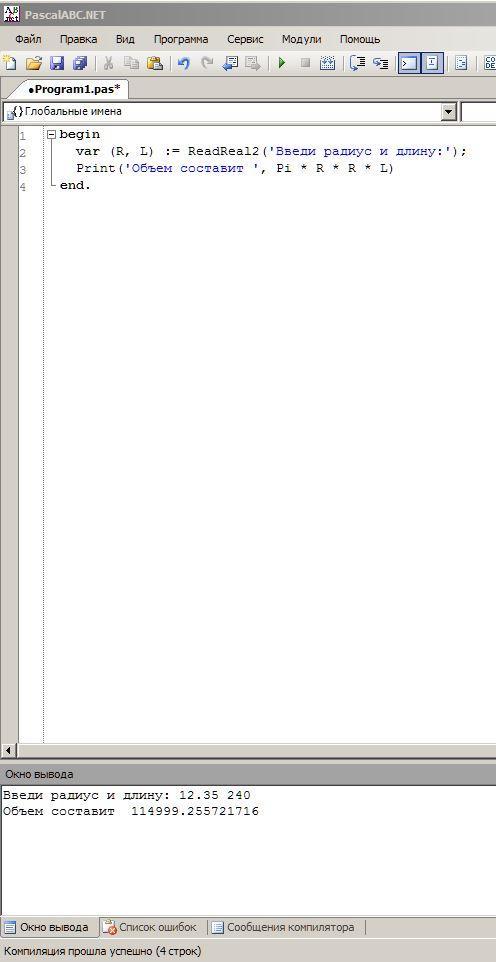 var (R, L) := ReadReal2('Введи радиус и длину:');