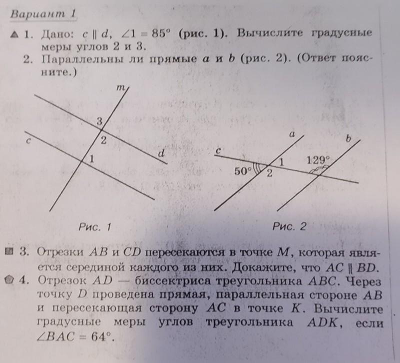 2) угол 1 = 50° ; угол 2 = 180° - 50° = 130° ; что бы прямые были параллельны, нужно что б угол 2 = 129, соответственно прямые не параллельны