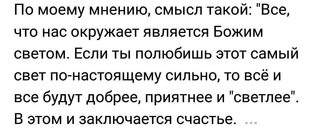 По моему мнению, смысл такой: "Все, что нас окружает является Божим светом. Если ты полюбишь этот самый свет по-настоящему сильно, то всё и все будут добрее, приятнее и "светлее". В этом и заключается счастье"
