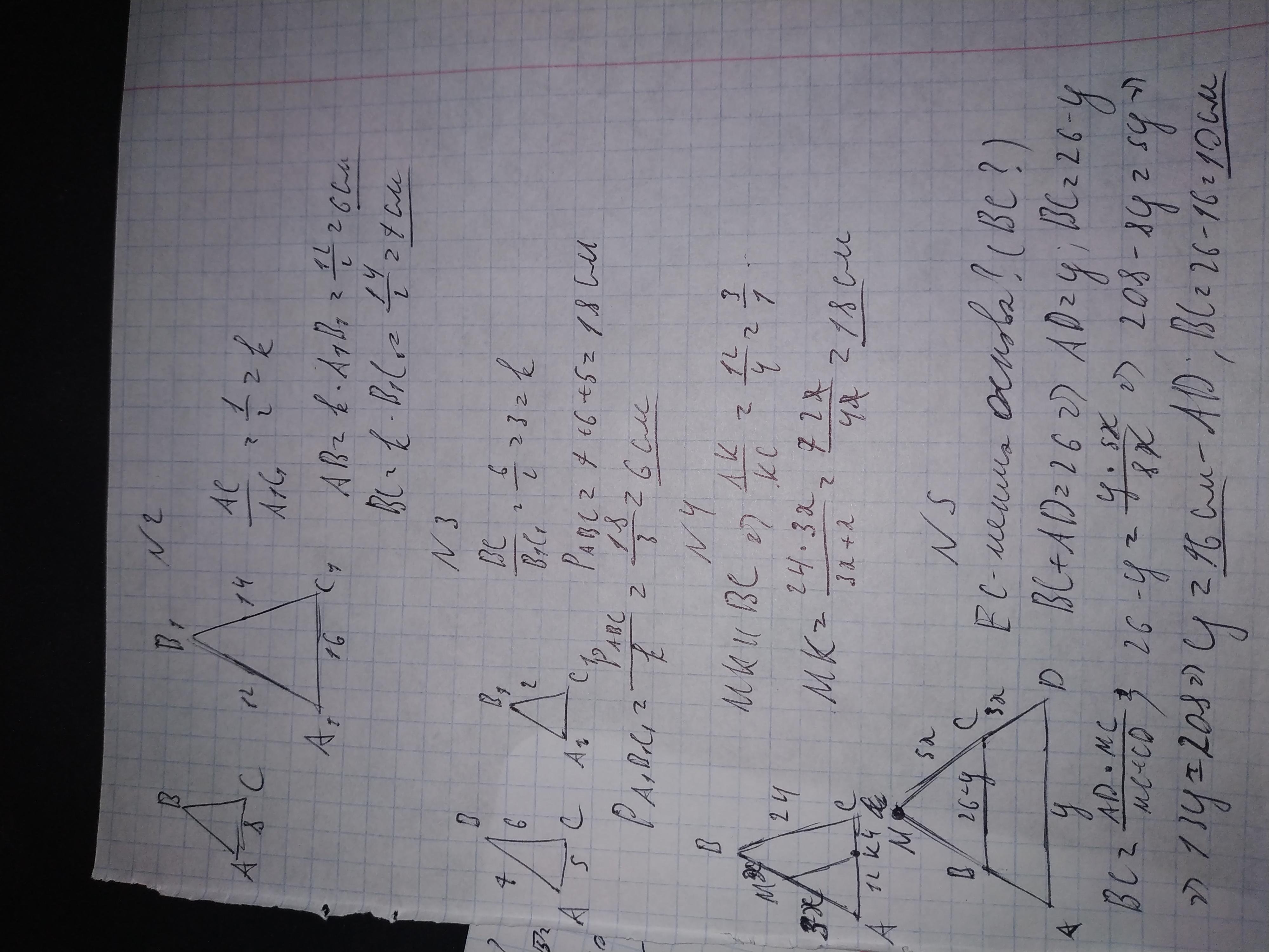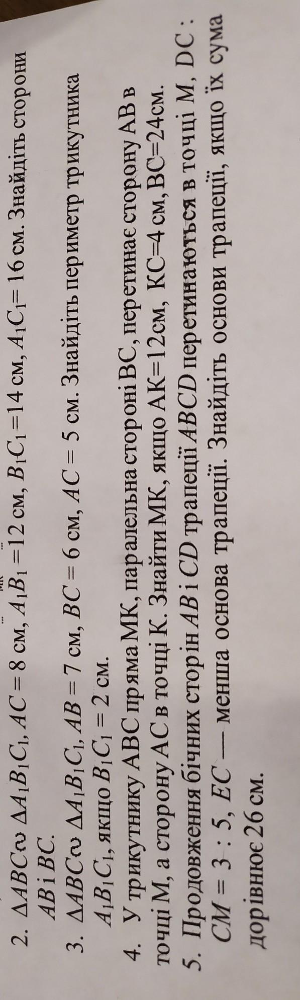 Ответ ко всем задачам на рисунке. Без теорем, ибо я их не особо помню, но там что-то по типу "паралельні прямі відтинають пропорційні відрізки" в 4-5, в 2-3 просто подобные треугольники.