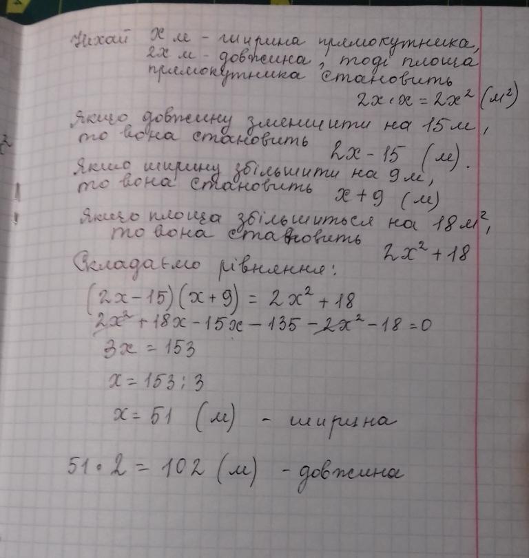 довжина прямокутника у 2 рази більша від його ширини . Якщо довжину прямокутника зменшити на 15 м. а ширину збільшити на 9м. то його площа збільщиться на 18 м. квадратних. Знайдіть довжину і ширину прямокутника