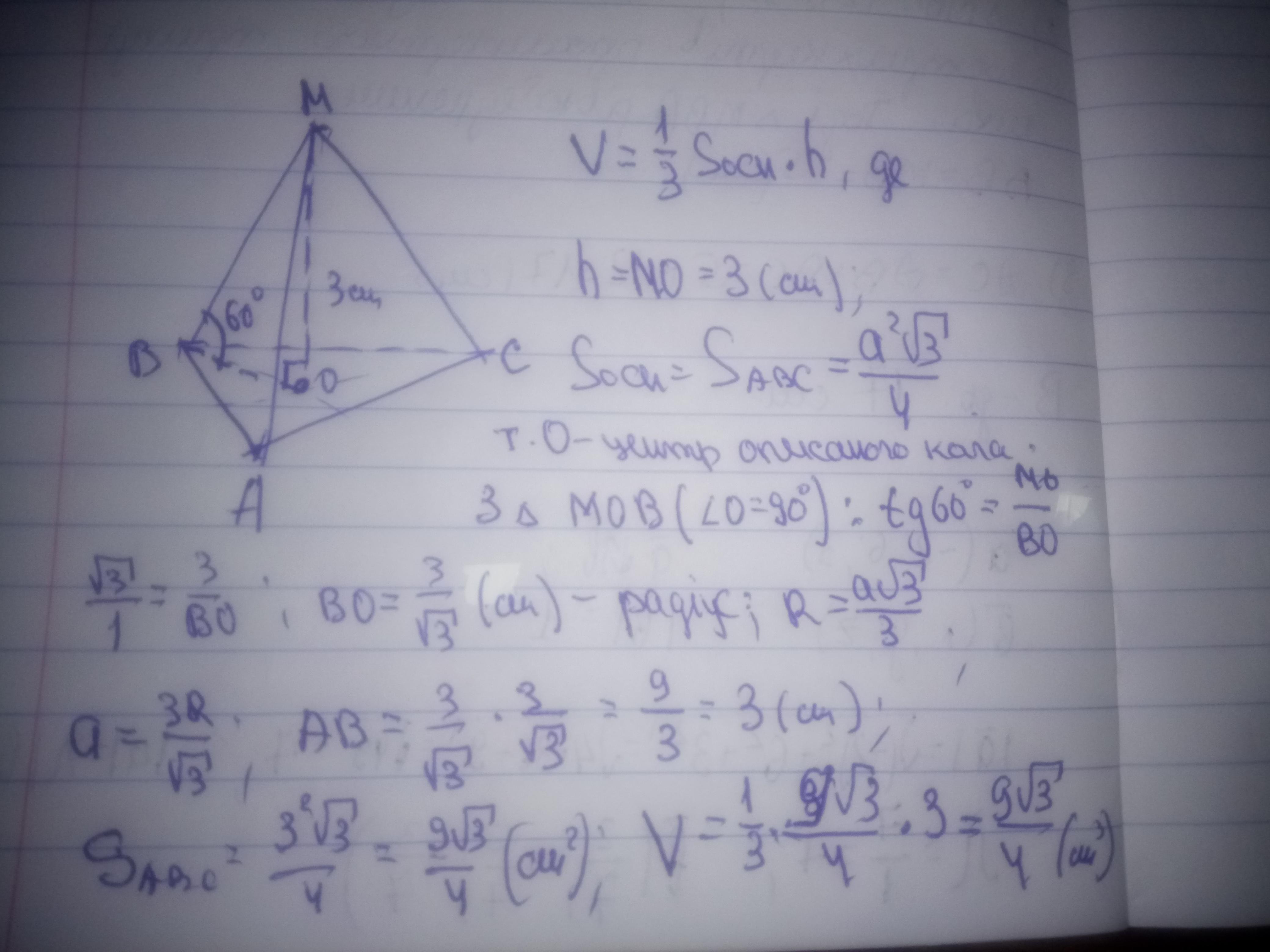 Висота правильної трикутної піраміди дорівнює 3 см і утворює з бічним ребром кут 60°. Знайдіть об'єм піраміди.