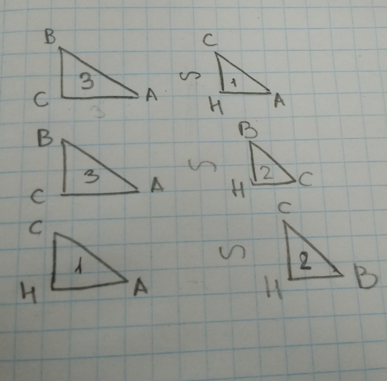 В прямоугольном треугольнике АВС из вершины прямого угла опущена высота СН и введены следующие обозначения образовавшихся прямоугольных треугольников: ДАСН 1, АВСН- 2, ДАВС- 3. Справа эти треугольники изображены как бы в «разобранном» виде. Заполните многоточия по смыслу.