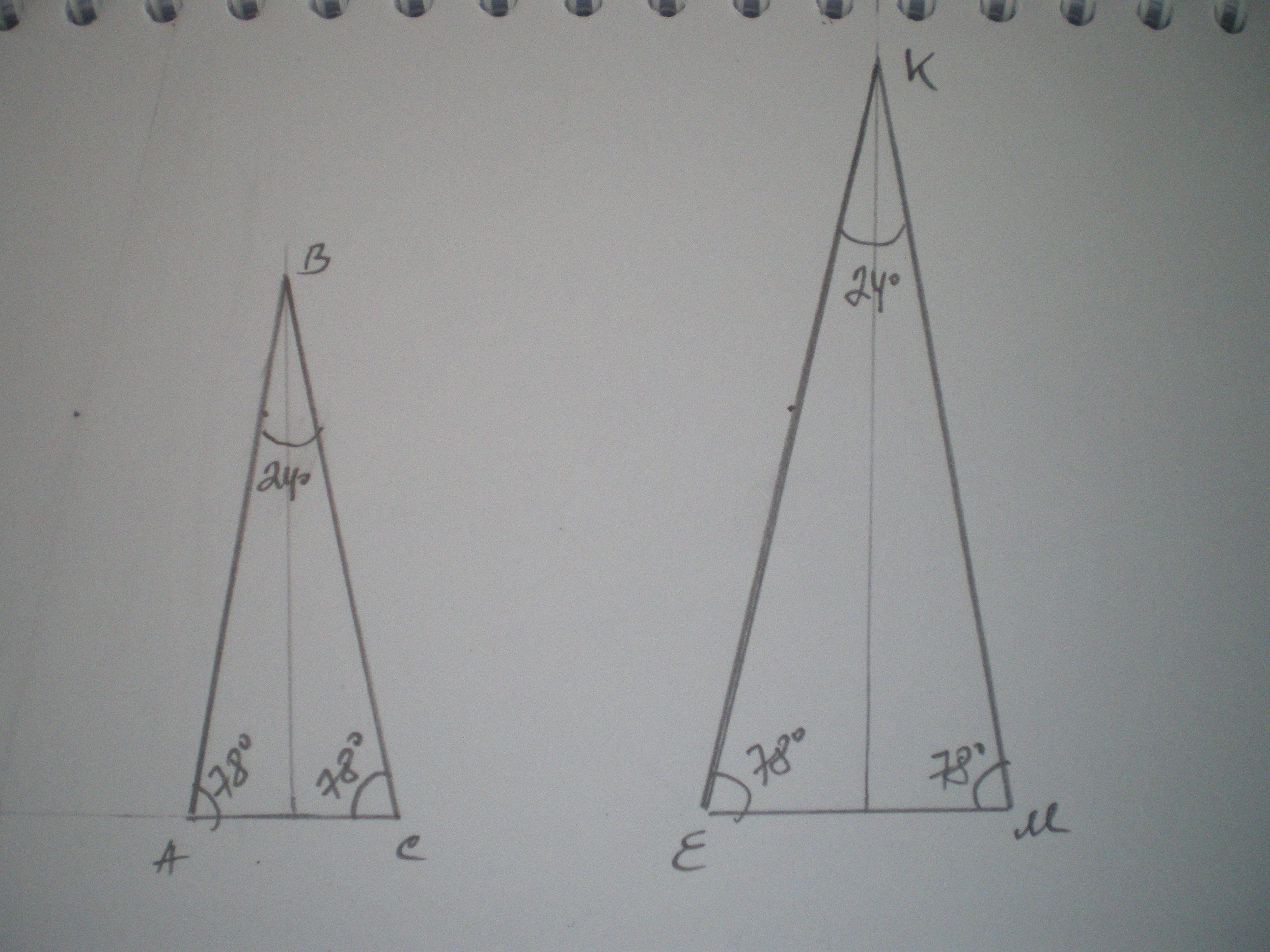 в одном равнобедренном треугольнике угол при вершине равен 24 градусов, а в другом равнобедренном треугольнике угол при основании равен 78 градусов. Подобны ли эти треугольники? Почему?