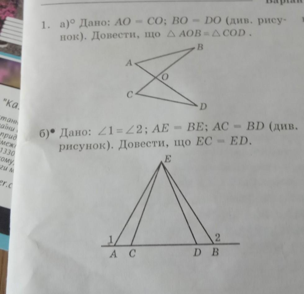 1. Т.к АО=СО ВО=ОD и угол АОВ= углу СОD(как вертикальные). Следовательно треугольники равны