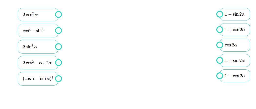 2cos^2a=1+cos2a\\cos^4a-sin^4a=(cos^2a-sin^2a)(underbrace {cos^2a+sin^2a}_{1})=cos^2a-sin^2a=cos2a\\2sin^2a=1-cos2a\\2cos^2a-cos2a=2cos^2a-(cos^2a-sin^2a)=cos^2a+sin^2a=1\\2cos^22a-cos2a=1+cos4a-cos2a\\(cosa-sina)^2=cos^2a+sin^2a-2, sina, cosa=1-sin2a\\\star ; ; 1+sin2a=sin^2a+cos^2a+2, sinacdot cosa=(sina+cosa)^2; ; star