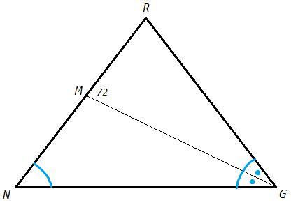 В равнобедренном треугольнике NRG проведена биссектриса GM угла G у основания NG, угол GMR = 72, определи величины углов данного треугольника