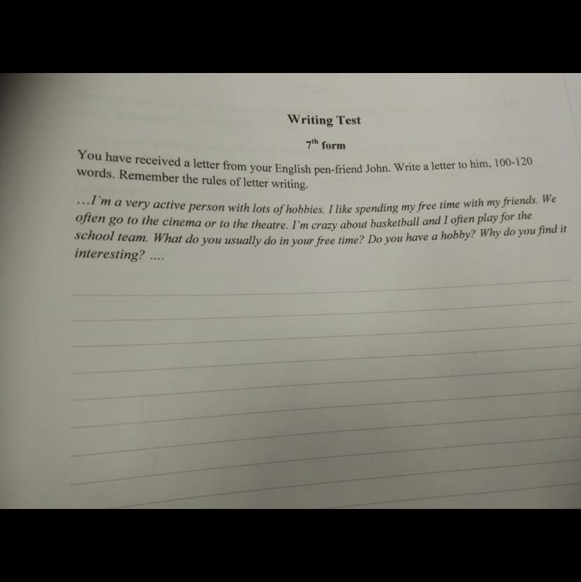 How is it going? Do you like your new school? Sorry I haven't written you long time. Thanks for your letter. I read your letter and want to be with you. I hope you had good holidays. Did you do anything interesting on this weekend? I hope so. You're crazy at basketball. So do I! I really like this sport! On my free time I usually write stories. My hobby is playing basketball. Because when I was 5 I watched Lakers's game, and thought that it's very interesting.