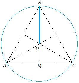 В равностороннем треугольнике медианы являются также высотами, следовательно лежат на серединных перпендикулярах. Медианы точкой пересечения делятся в отношении 2:1 от вершины. Отрезок от вершины до точки пересечения - радиус, и он равен 2/3 медианы.