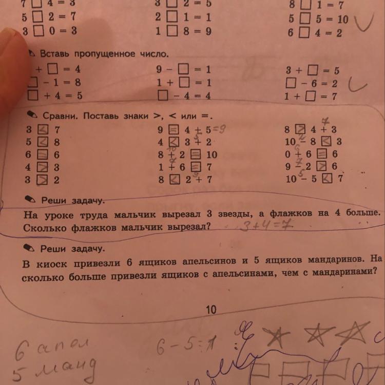 На уроке труда мальчик вырезал 3 звезды , а флажков на 4 больше. Сколько флажков вырезал мальчик ?