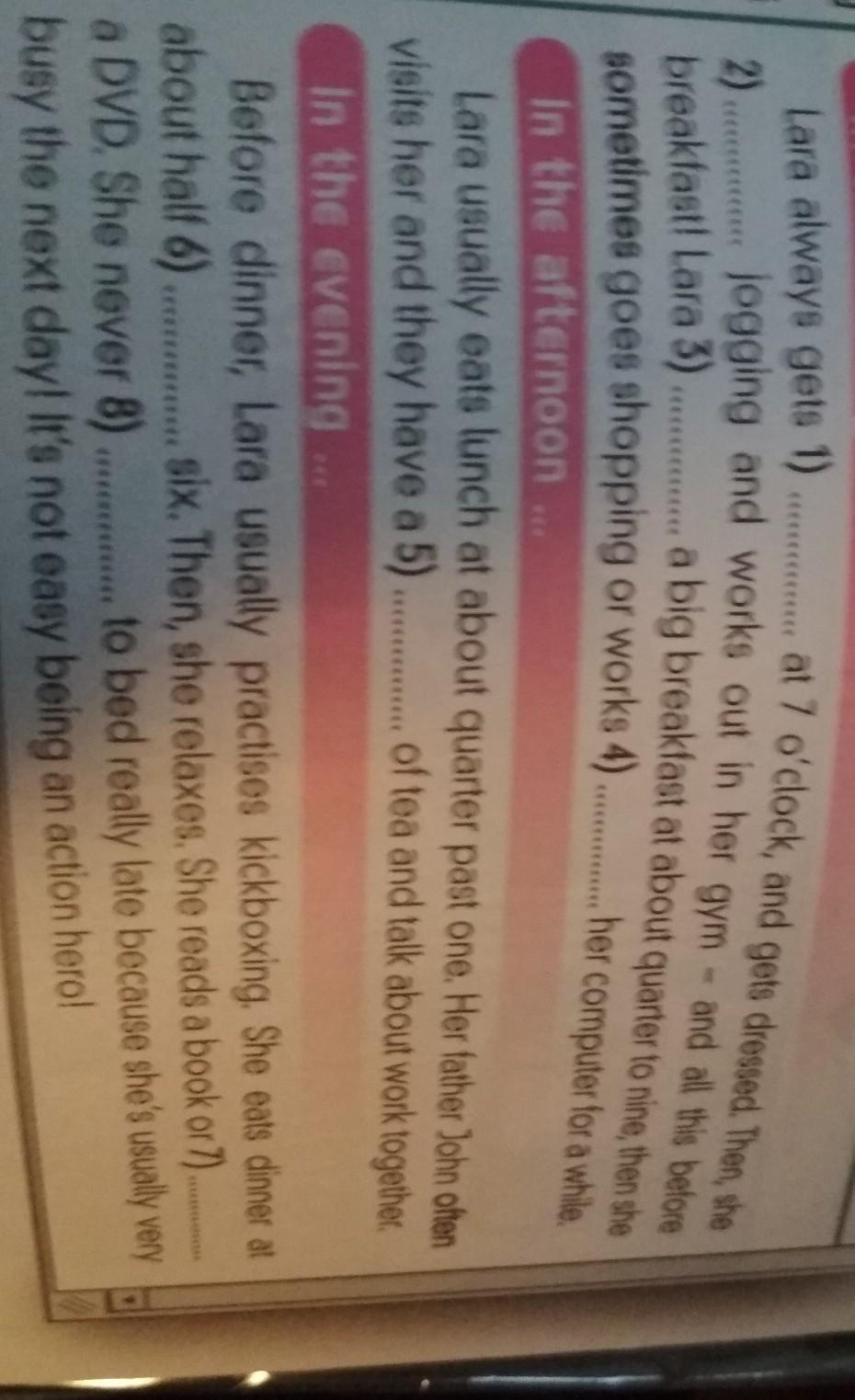 Before dinner, lara practises kickboxing. she eats dinner at about half past . Then, she relaxes. She reads a book or watches a dvd . She never goes to bed really late because she`s usually very busy the next day! It ` s not easy being an action hero!