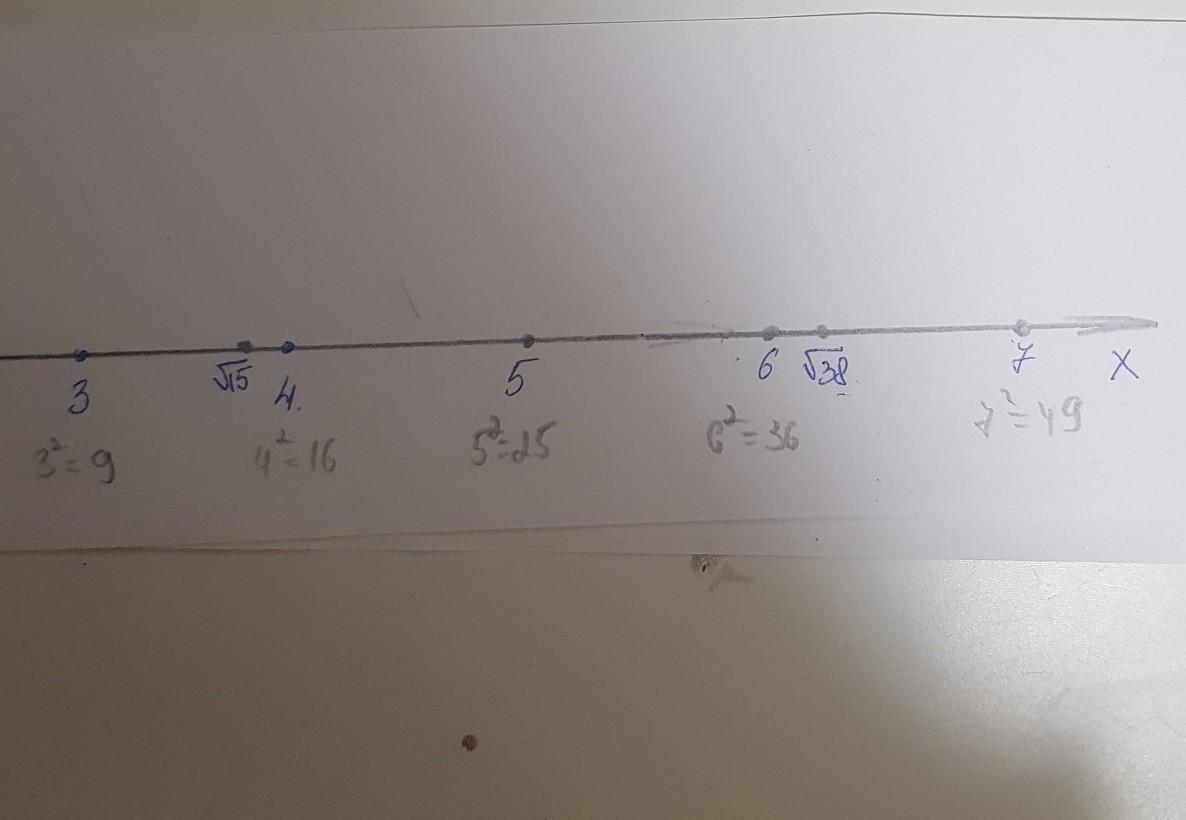 Возводим числа на координатной прямой в квадрат: .....3^2=9, 4^2=16, 5^2=25, 6^2=36, 7^2=49...., и смотрим, к какому числу близко число под корнем, т.е. *корень из 15* находится между *корнем из 9*(это число 3) и *корнем из 16*(это число 4)