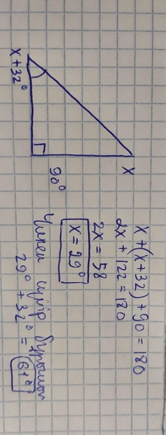 үшбұрыштың барлық бұрыштарының қосындысы 180 градусқа тең. осыдан келесі теңдеуді құру керек. жауабы 29 және 61. Үлкен сүйір бұрышын сұрап тұрғандықтан жауап 61 градус