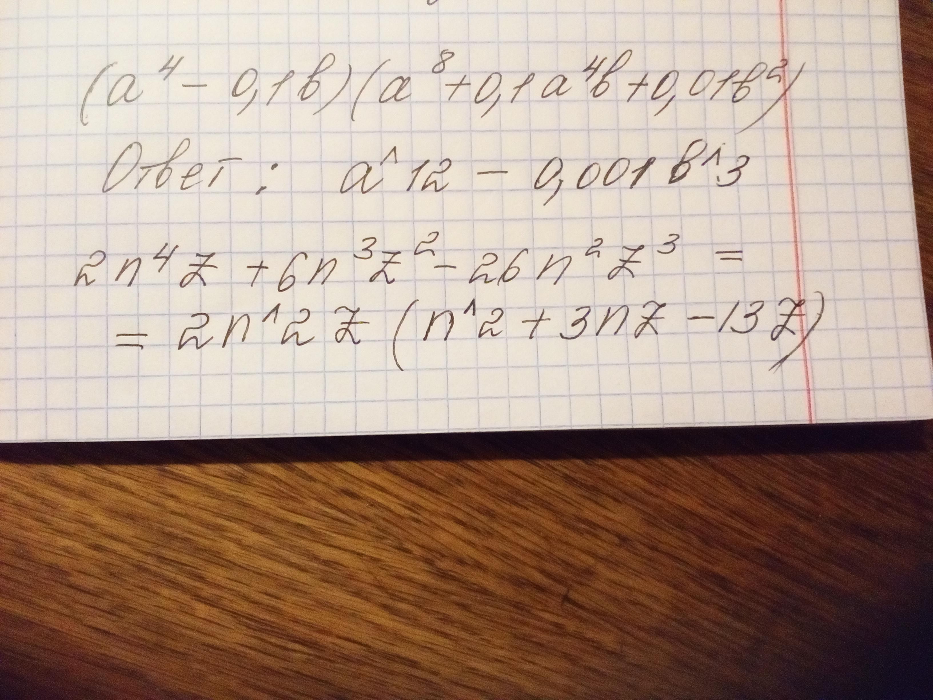 (a⁴ - 0,1b)(a⁸ + 0,1a⁴b + 0,01b²) = (a⁴)³ - (0,1b)³ = a¹² - 0,001b³