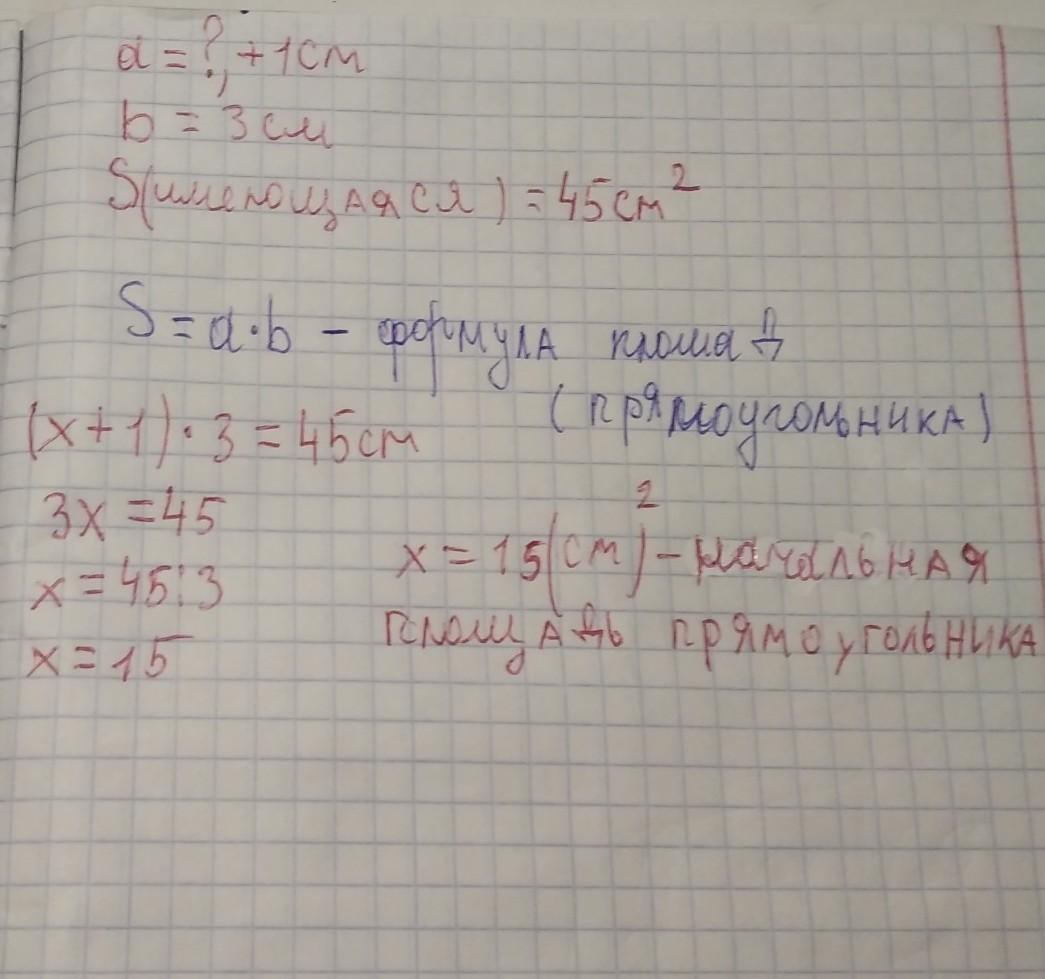 прямоугольник ширина которого 3 см. после увеличение его длины на 1 см его площадь стала 45см^2 .найти площадь начальной прямоугольника