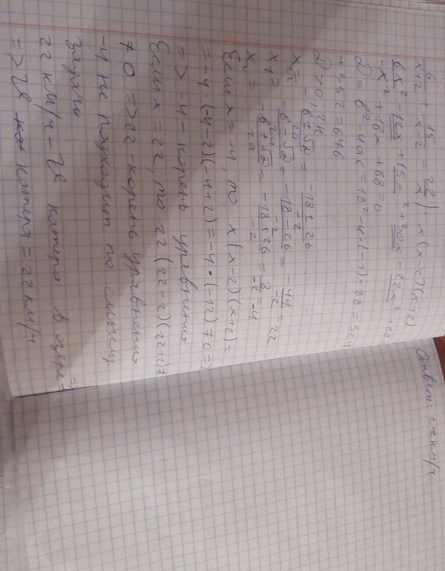 Проверьте решение и правильность ответа.Задача звучит так:«Катер прошёл 15 км против течения и 6 км по течению, затратив на весь путь столько времени, сколько ему потребовалось бы, если бы он шёл 22 км по озеру.Какова собственная скорость катера, если известно, что скорость течения реки равна 2 км/ч».