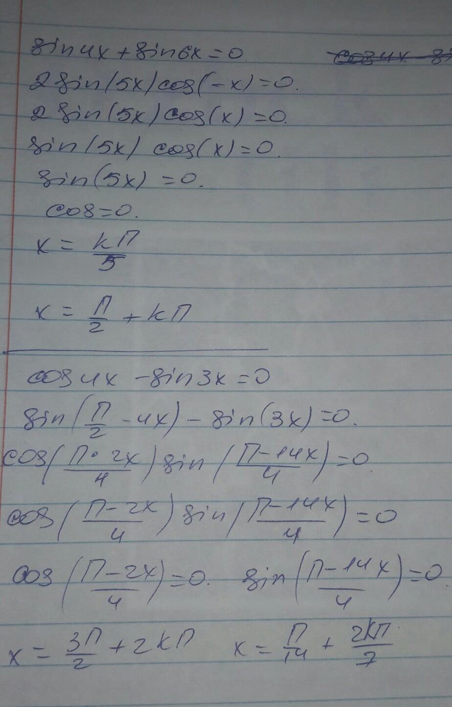 Ребята помогите 1) sin4x+sin6x=0. 2) cos4x-sin3x=0. 3) sin(П/4-x) -cos (П/4-)<-1. ПОМОГИТЕ!!!!!! Пожалуйста.