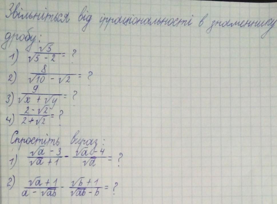 Чтобы освободиться от иррациональности в знаменателе, в первом задании нужно применить знакомую формулу (a-b)(a+b)=a²-b².