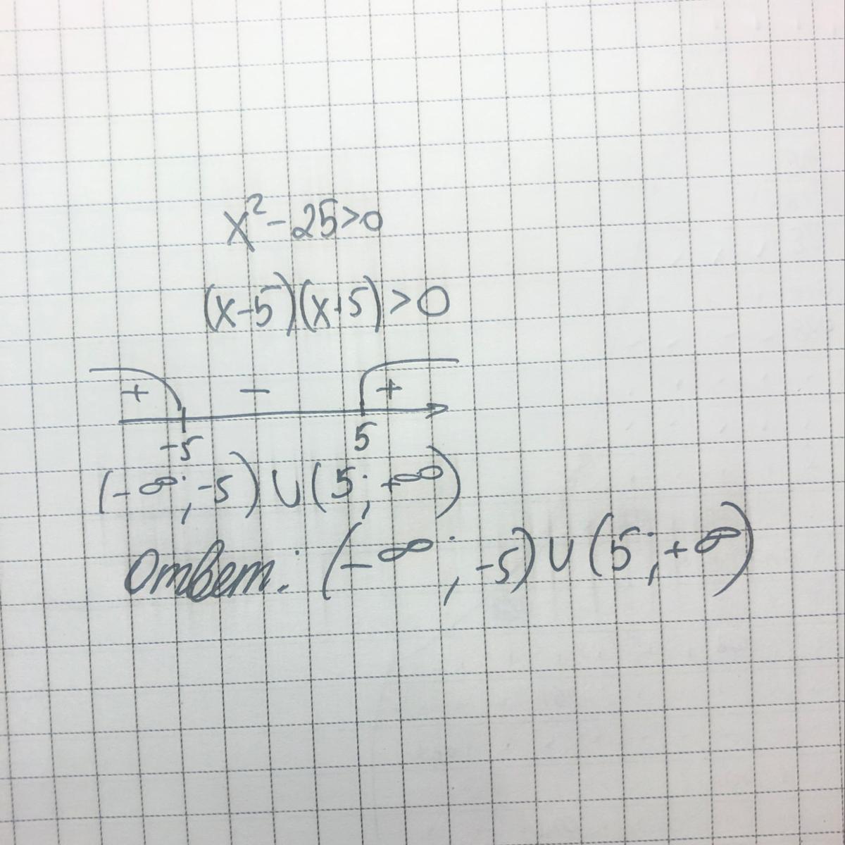 Ответ: x^2-25>0⇒х^2>25⇒x1>5