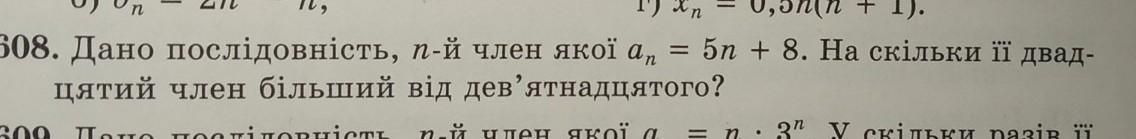 Т.к. это соседние элементы последовательности, то достаточно рассмотреть а с индексом n, т.е 5n + 8, и а с индексом n+1, т.е. 5(n + 1) + 8.