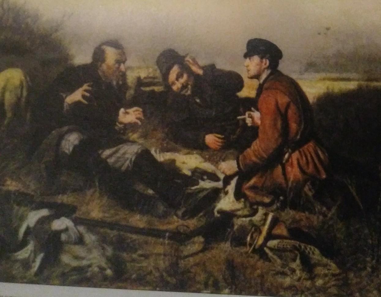 Ответ: Главной чертой картины являются психологические портреты героев: один из них (слева) — пожилой, опытный охотник, видимо, из оскудевших дворян с увлечением и страстью рассказывающий о своих охотничьих «подвигах», второй (на втором плане) — средних лет, в русской крестьянской одежде, недоверчиво и с ухмылкой слушающий охотничьи байки своего собеседника, третий же (справа) — одетый «с иголочки» доверчивый молодой новичок, с трепетом выслушивающий россказни первого охотника, настолько заморочившими его, что он даже забывает зажечь папиросу в правой руке заготовленным в левой огоньком.
