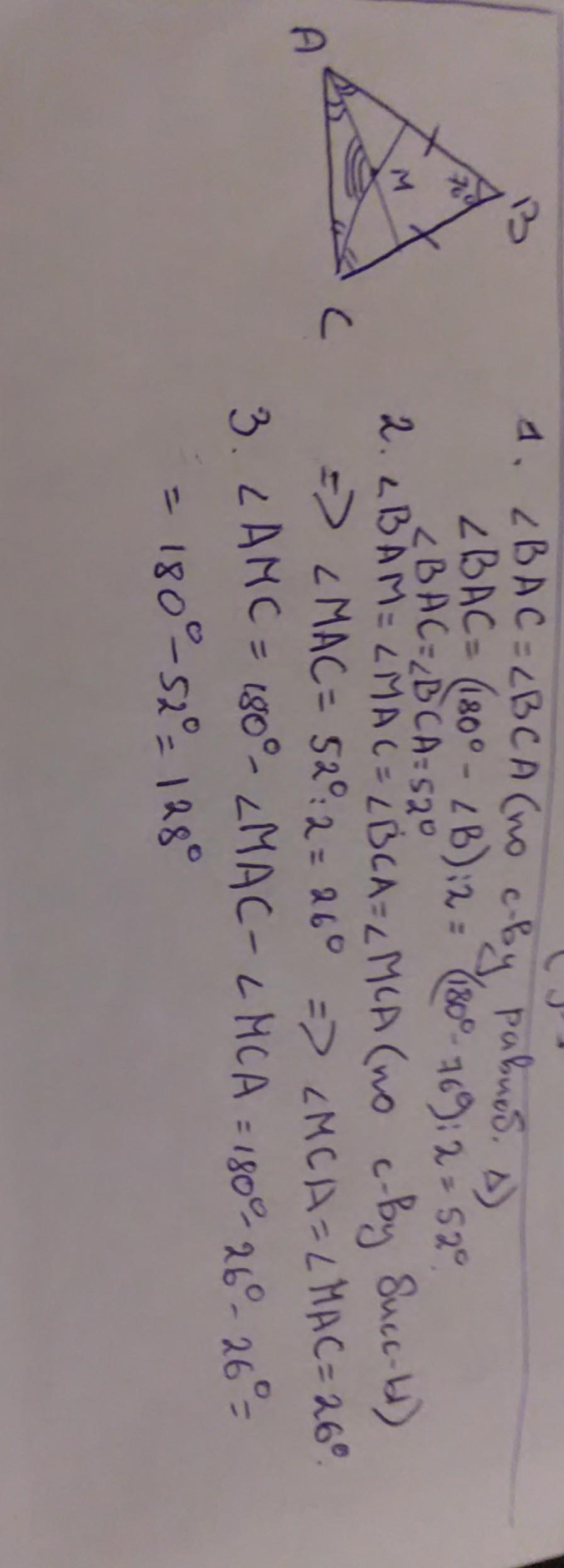 В треугольнике ABC стороны ab и bc равны, угол b =76° биссектрисы углов a и b пересекаются в точке m. Найдите величину угла AMC